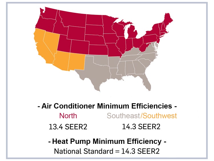These new government regulations apply to all manufacturers in the HVAC industry. For air conditioners, the Department of Energy’s new minimum efficiency standards varies by region, so your choice of AC units depends on where you live. For heat pumps, the new standard is uniform across the nation. The DOE’s regional breakdown by state is as follows: